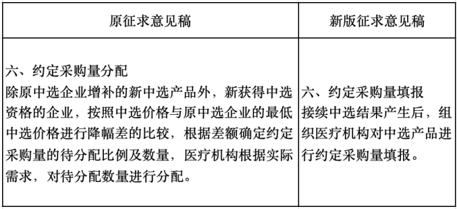 約定采購量分配規(guī)則方面也有調(diào)整,按降幅差分量的內(nèi)容被刪掉,替換為醫(yī)療機構(gòu)對中選產(chǎn)品進行約定采購量填報。