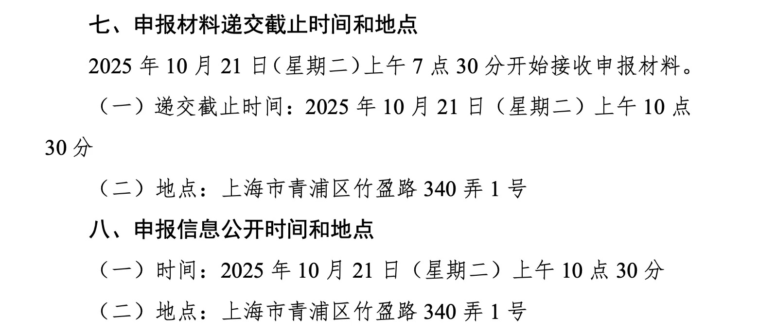 第十一批國(guó)采自10月21日(星期二)上午7點(diǎn)30分開(kāi)始接收申報(bào)材料,遞交截止時(shí)間為當(dāng)日上午10點(diǎn)30分,地點(diǎn)為上海市青浦區(qū)竹盈路340弄1號(hào);申報(bào)時(shí)間和地點(diǎn)同上。