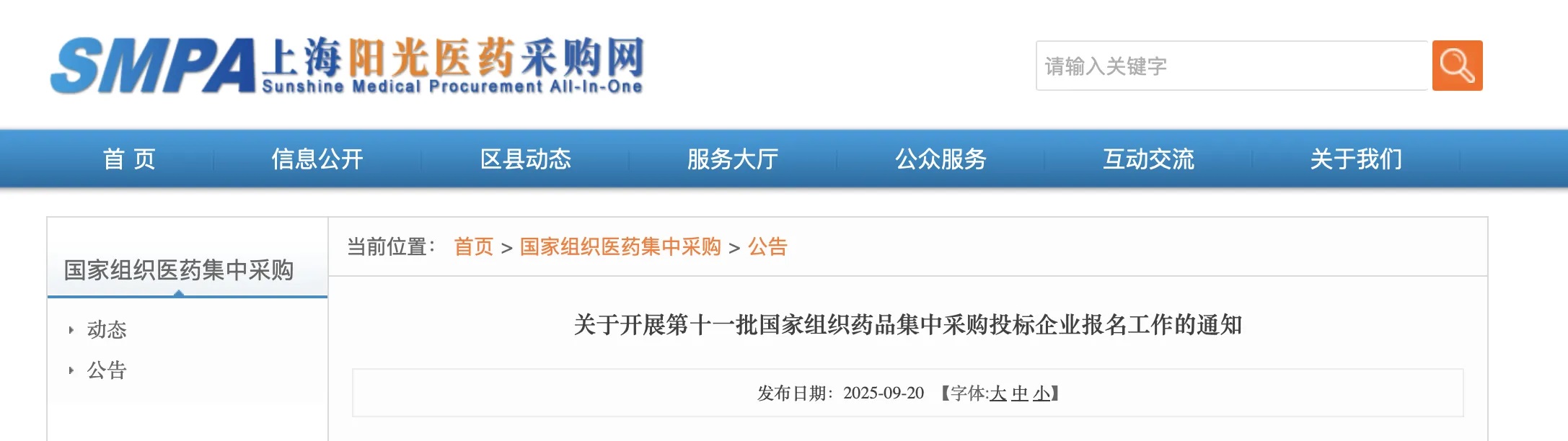 同日,國(guó)家組織藥品聯(lián)合采購(gòu)辦公室發(fā)布《關(guān)于開(kāi)展第十一批國(guó)家組織藥品集中采購(gòu)?fù)稑?biāo)企業(yè)報(bào)名工作的通知》。