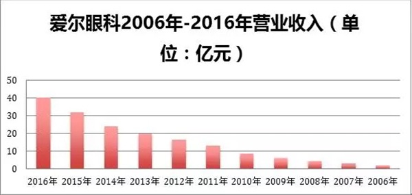 從私立眼科龍頭上市公司愛爾眼科的財報中可以看出,公司自有記載的經(jīng)營數(shù)據(jù)開始,從2006年的1.91億到2016年的40億,11年間營業(yè)收入增加了近20倍,而同比國內(nèi)的眼科服務(wù)市場增量,據(jù)衛(wèi)計委提供的統(tǒng)計年鑒,2005年眼科專業(yè)醫(yī)院的收入是16億,到2015年整個規(guī)模為140億,11年間增加了近8倍。